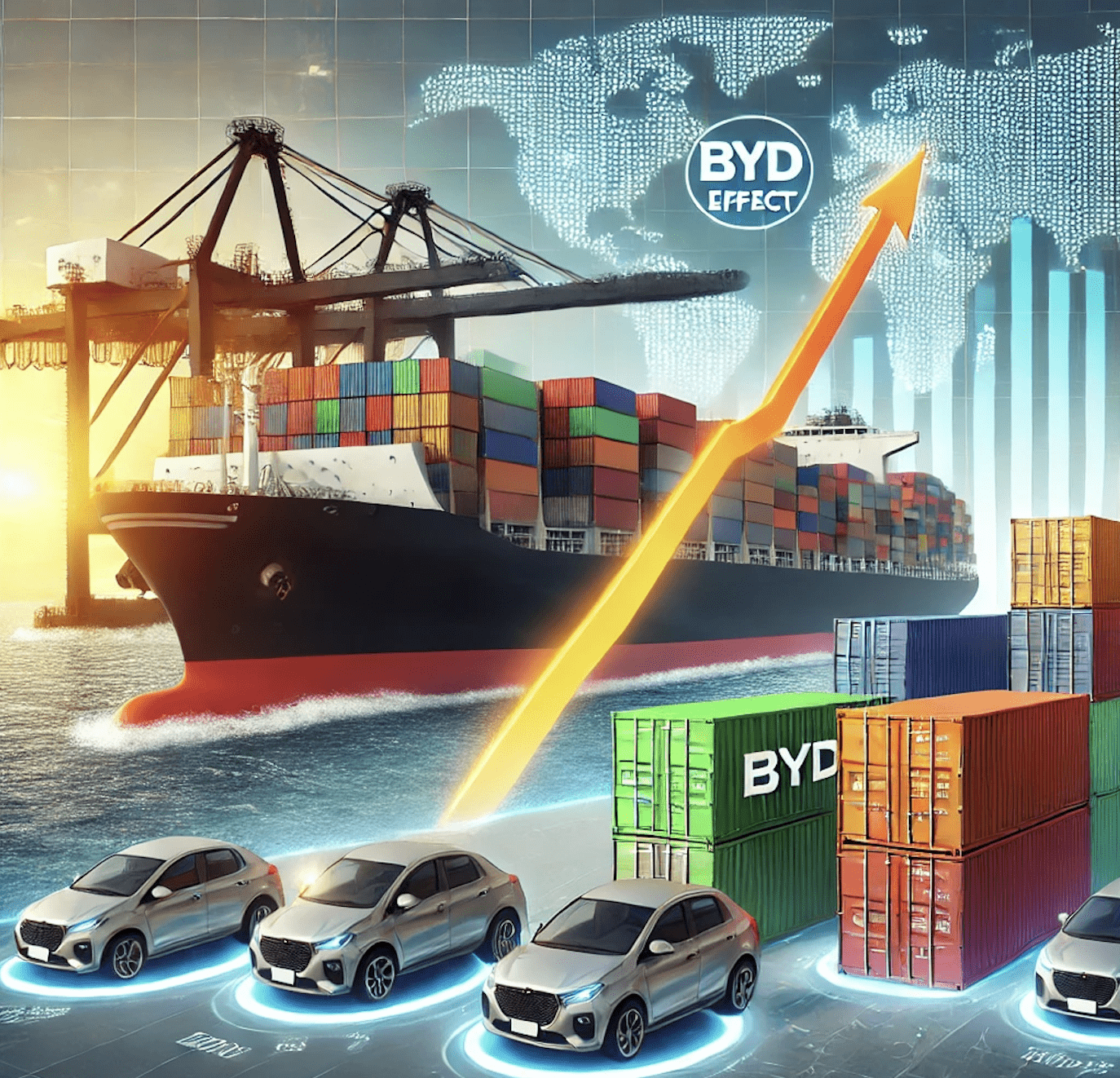 Um fator adicional que tem gerado grande impacto é o chamado Efeito BYD. Esse efeito resulta da entrada massiva da fabricante chinesa de automóveis BYD no mercado brasileiro, o que aumentou a demanda por transporte de autopeças e veículos, pressionando ainda mais os custos de frete.